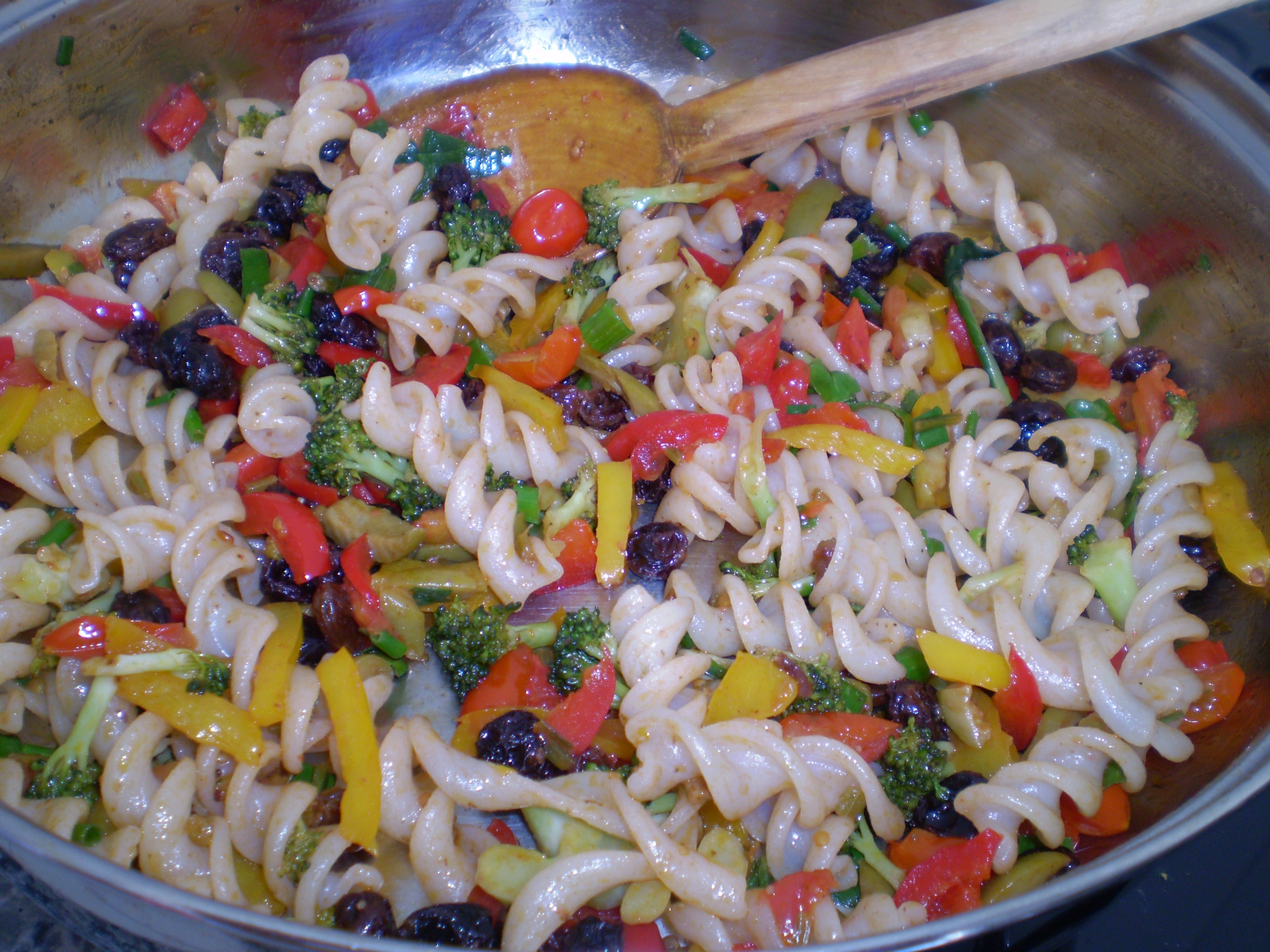 Coloque em uma frigideira o azeite e acrescente os ingredientes picados e refogue até cozinhar deixando uma textura macia e firme. Acrescente o cheiro verde e a massa escorrida. Servir quente.