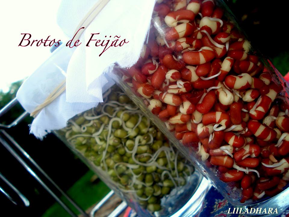 Catar e lavar o feijão, coloque o feijão no vidro com água filtrada coloque o tecido na boca do vidro e prenda com o elastico deixe de molho por uma noite inteira, no dia seguinte vire o vidro, e deixe a água escorrer, deixe em um lugar ventilado e com boa claridade, ate formar os brotos, o feijão moyashi demora aproximadamente 2 dias, o feijão azuki uns 3 dias, caso o feijão receque, acrescente um pouco de água filtrada e escorra. Os brotos duram em media 6 dias.