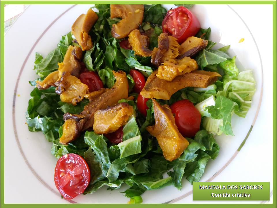 Pique as folhas verdes e o tomate. Reserve. Leve ao fogo uma frigideira coloque um pouco de azeite, sal rosa, pimenta-do-reino e curry, acrescente o shitake. Meixa pra cozinhar igual. Se precisar coloque água aos poucos. Monte o prato, Bon appétit!! Hummm…tudo de gostoso! Rico em proteína, vitamina B12, cálcio, ferro e fibras.