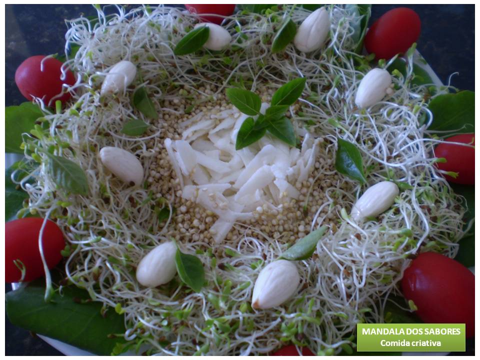 Salada nutritiva rica em cálcio (broto de alfafa), ferro (rúcula), proteína (broto de guinoa), vitamina E (amêndoas), inhame age como regulador hormonal para as mulheres, depurativo do sangue e puro colágeno, óleo de coco gordura boa e ajuda emagrecer. Bon appétit!!!