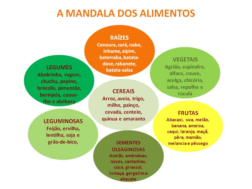 A Mandala dos Alimentos simboliza o universo dos alimentos vegetais, é divido em sete grupos relacionados com a categoria de cada um e suas características, propriedades e valores nutricionais. No quadro temos todos os componentes nutricionais para manter o equilíbrio das funções orgânicas diariamente, que nos garantem a saúde e a vitalidade física e mental. Para formar um prato bem feito – o básico de uma boa refeição – precisamos de um dos cereais, um dos feijões, uma das sementes, uma das raízes, um dos legumes e folha verdes.